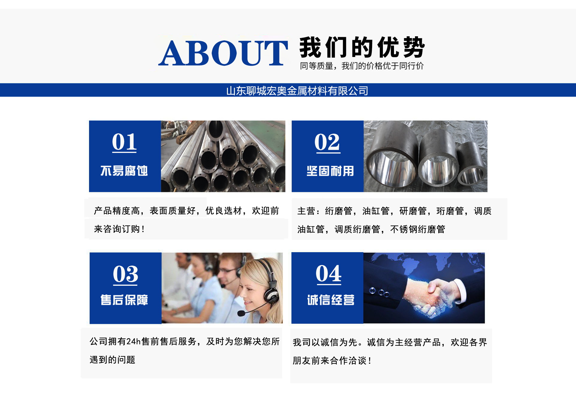 山東聊城宏奧金屬材料有限公司位于風(fēng)景秀麗的江北水城-聊城。地理位置優(yōu)越,交通便利。主營絎磨管,油缸管,研磨管,珩磨管,調(diào)質(zhì)油缸管,調(diào)質(zhì)絎磨管,不銹鋼絎磨管等產(chǎn)品 廣泛應(yīng)用于礦山、起重、船舶、煤炭、運輸、化工、科研、軍工等工業(yè)領(lǐng)域。 公司憑借雄厚的實力,豐富齊全的規(guī)格品種,完善的質(zhì)量保證,合理的價格,優(yōu)質(zhì)的服務(wù),不斷地受到新老用戶及業(yè)內(nèi)人士的肯定和信任,我們本著及用戶之所及,想用戶之所想的服務(wù)宗旨不斷地拼搏,進取,在此對多年來支持我們的各行各業(yè)的新老朋友表示由衷的感謝,愿我們今后的合作更加愉快! 歡迎國內(nèi)外新老客戶來公司視察、蒞臨指導(dǎo)工作!...